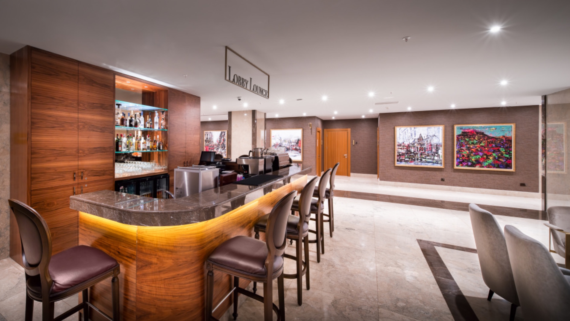 Lobby-Lounge und Cafe: Ein schicker und einladender Raum, in dem die Gäste eine Reihe von Getränken genießen können, von Kaffee und Tee über Cocktails und Aperitifs bis hin zu leichten Snacks und Gebäck.